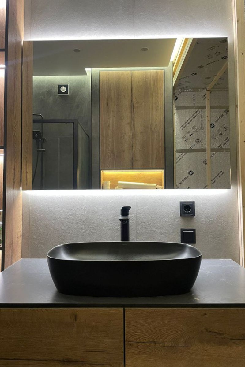 Кроме того, для этого проекта мы изготовили зеркала по дизайн-проекту, включая зеркало с подсветкой для помещения с сауной. Подсветка, установленная сверху и снизу, создаёт мягкое и уютное освещение, подчёркивая атмосферу релакса. Заказчик доволен, проект выполнен успешно на 100%!