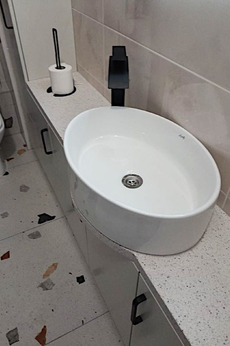 Команда "Дизайн Стекло" создали мебель для ванной комнаты по индивидуальному проекту. Мы учли все особенности помещения: глубина столешницы была адаптирована под дверной наличник, трубы за тумбой аккуратно обойдены, а шкаф спроектирован специально для хранения хозяйственного инвентаря. В нижней части шкафа предусмотрена дверца на магнитах для удобного доступа.