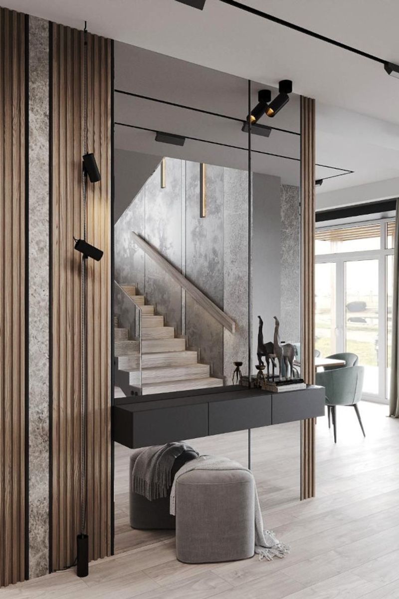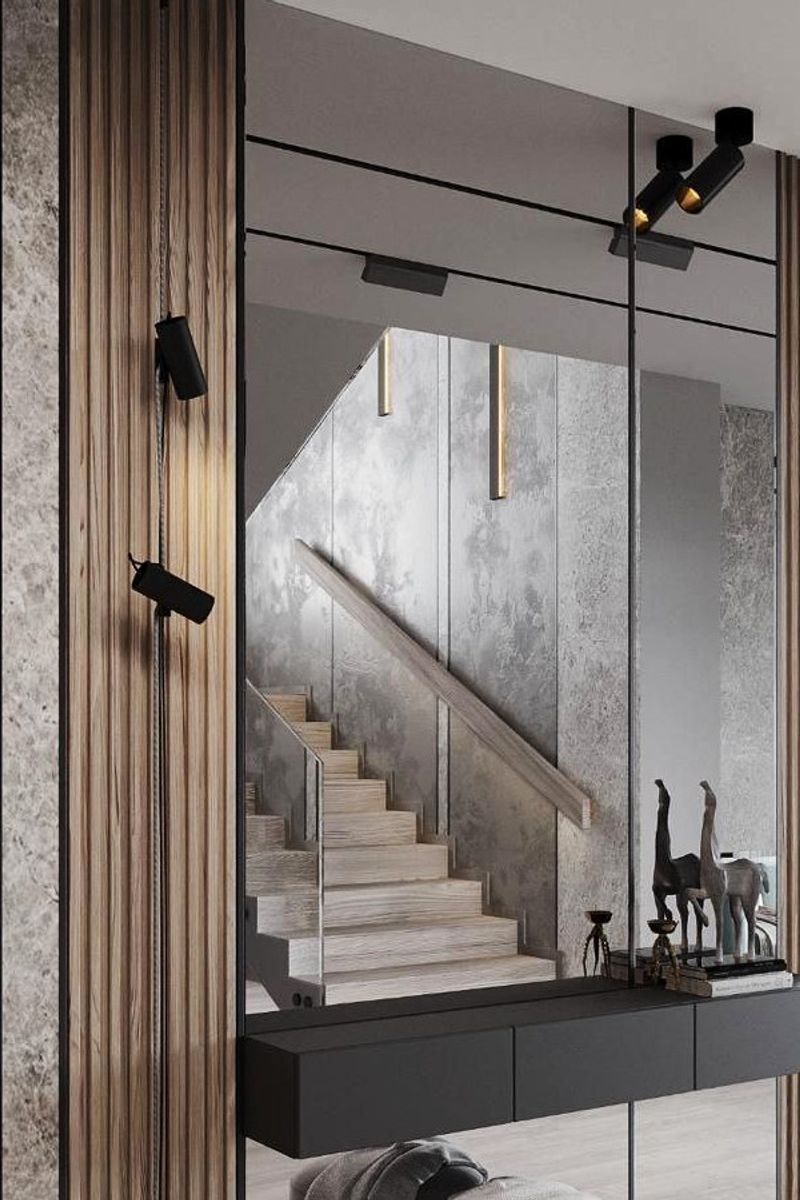 Зеркало изготовлено в соответствии с индивидуальным дизайнерским проектом. Конструкция предполагает расположение зеркала как над, так и под тумбой, с четким делением по вертикали. Черная декоративная планка толщиной 18 мм стала выразительным элементом дизайна, удачно дополнив общую цветовую гамму интерьера и зрительно увеличив высоту изделия.