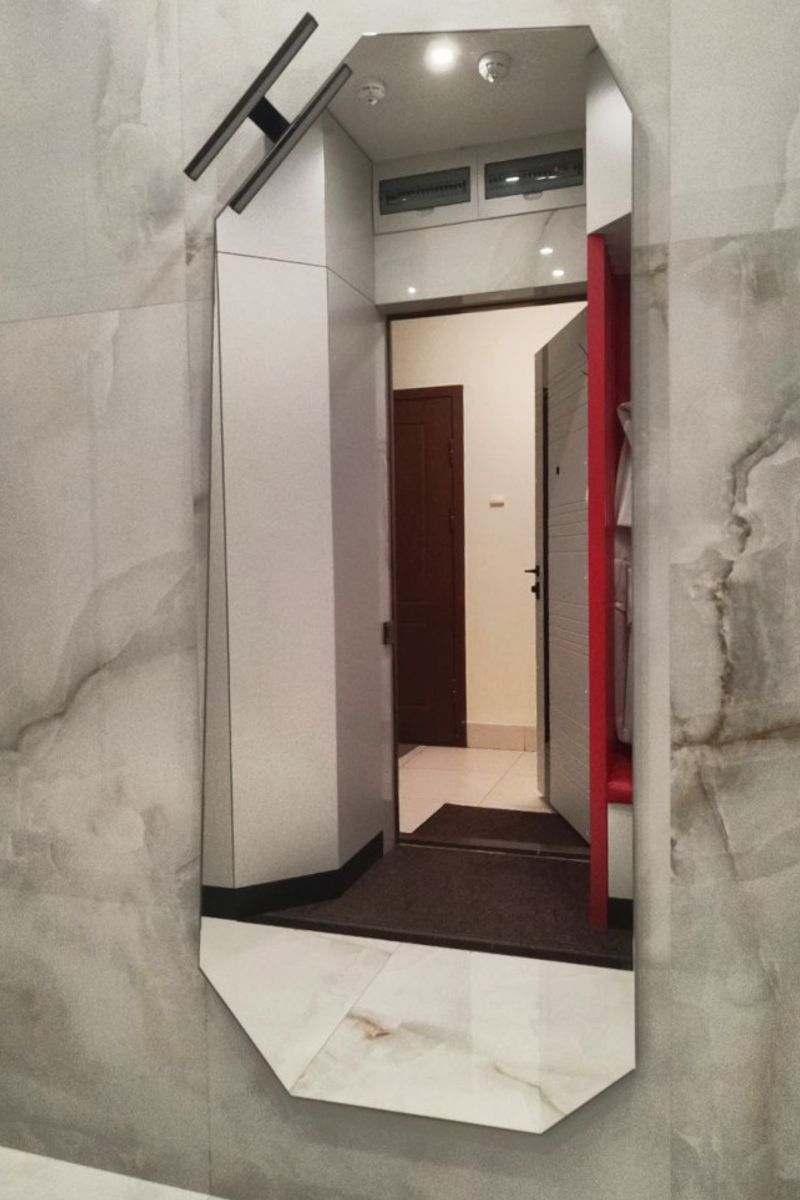 Заказчик команды "Дизайн Стекло" добавил в свой интерьер изысканность и оригинальность с изготовленным нами зеркалом необычной формы. Изделие выполнено на прочной МДФ-подложке с глянцевой кромкой, окрашенной в элегантный чёрный цвет. Уникальный дизайн с наклоном и встроенным светильником на верхнем ребре зеркала придаёт ему современный и стильный вид.